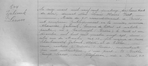 “On 30th May 1925, at one o’clock in the morning, Paulette Séverine ZALIOUK, born in the eleventh arrondissement of Paris on 15th April 1916, daughter of Alexandre ZALIOUK, a painter, and Berthe Faeige LERNER, his wife, died at the home of her father and mother, avenue de la République 59. Prepared on 30th May 1925, at twelve fifteen, on the declaration of Roger RIVET, twenty-three years old, employee, rue Notre Dame de Nazareth 24, who, having read it, signed with Us Eugène KIRSCH, officer of the Legion of Honour, deputy mayor of the eleventh arrondissement of Paris.”