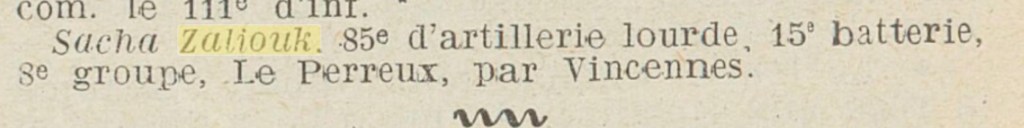 ZALIOUK – Pour le moment jes suis en bonne santé toujours en course, car je suis agent de liaison, cycliste, à pied et enfin motocycliste. Je continue à servir dans le même group quoique j’ j’avais quelques idées de quitter le front, mais à présent si je ne suis pas …. zig …. je tacherai d’aller revoir mes frères Russes, qui ne sont pas toujours d’accord. Je veuxyy aller si c’est possible et faire une propagande en faveur de la France. Mes Amitiès aux Copains [sic]