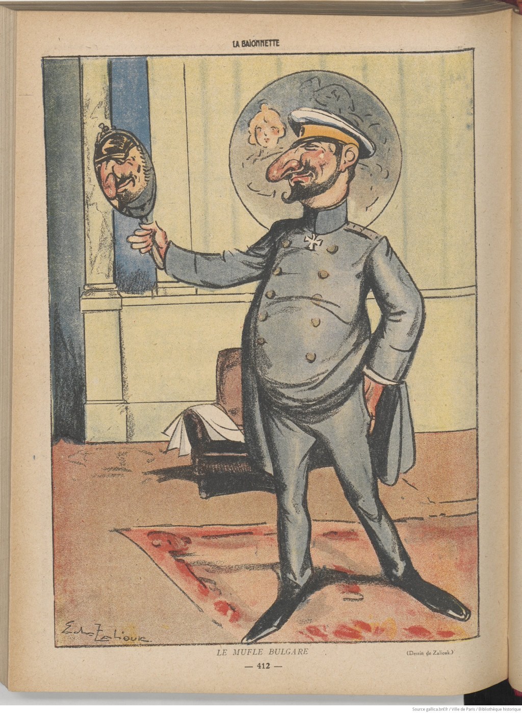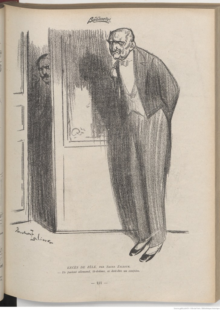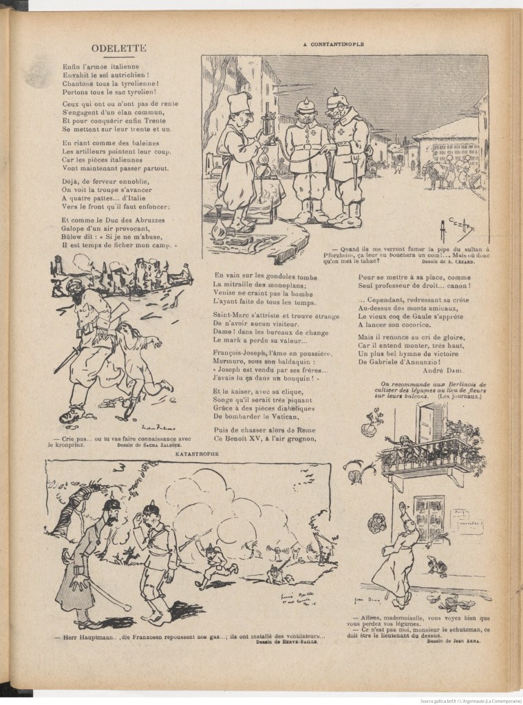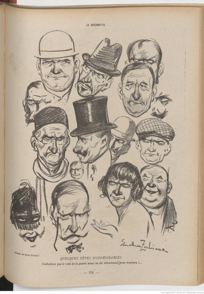 Sacha contributed to various satirical magazines during the war, including La Baïonnette, one of the most well-known and which included more direct depictions of the war than the society of the time expected (source). The featured image of this post comes from its December 1915 edition (source) and more from La Baïonnette are shown below: